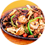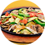 Steak, Chicken, 5 Shrimp and Chorizo. Onions, bell peppers and tomatoes. Served with rice, beans, lettuce, sour cream, guacamole, pico de gallo and four tortillas.
