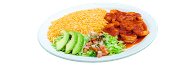 3 Chicken enchiladas. Served with rice, lettuce, enchiladas sauce guacamole, shredded cheese, tomato and sour cream.
