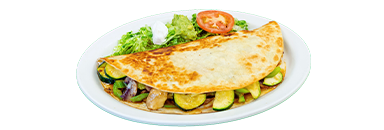Sliced zucchini and mushrooms. Onions, bell peppers and tomatoes. Served with rice, beans, lettuce, sour cream, guacamole, pico de gallo and four tortillas.